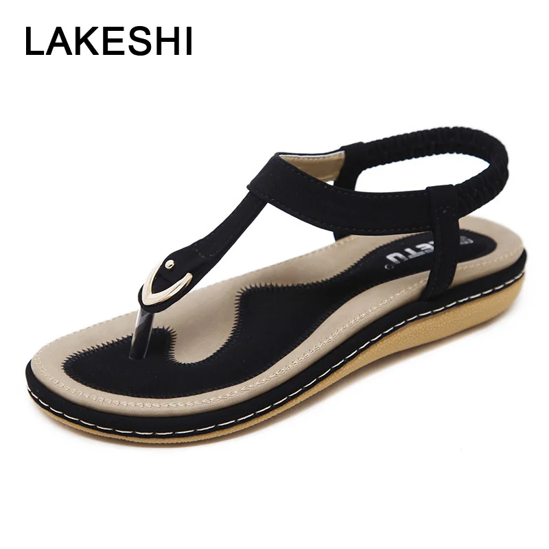 استعارات من LAKESHI الوجه يتخبط النساء الصنادل البوهيمي المرأة النعال النساء حذاء مسطح صنادل سيدات 2019 الصيف صنادل شاطئ حجم 10