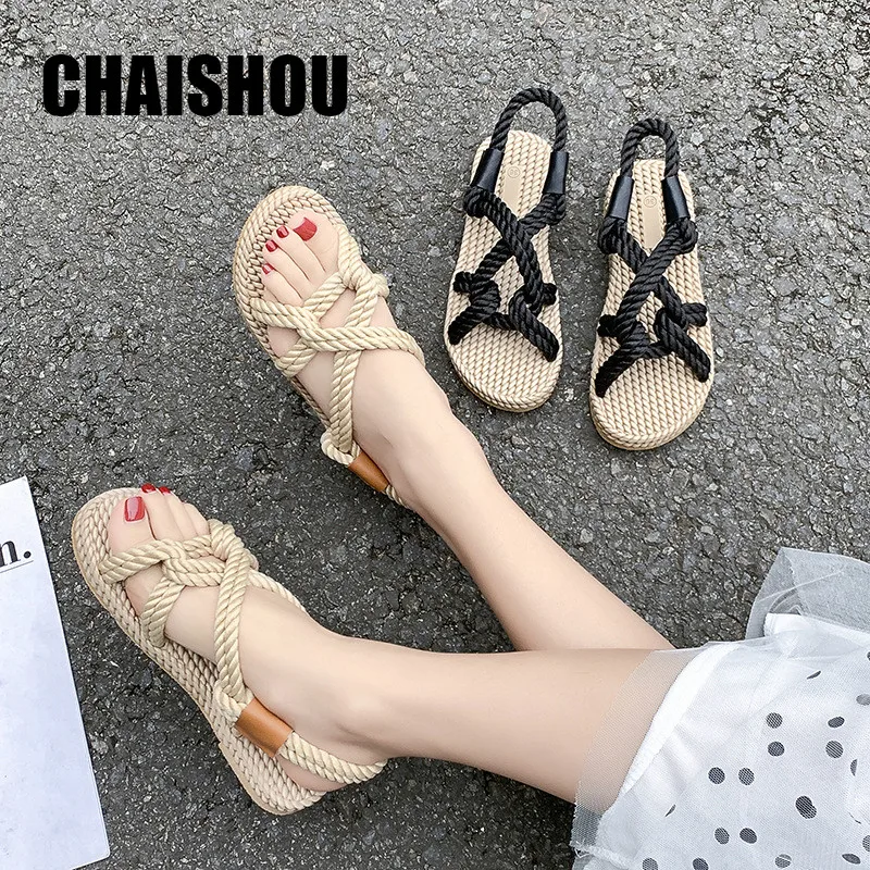 المنتجات ذات الصلة ل Sandals و CHAISHOU أحذية امرأة الصيف حبل النسيج الانزلاق على صنادل شاطئ المصارع الصليب مرتبطة أحذية zapatos موهير CS-504
