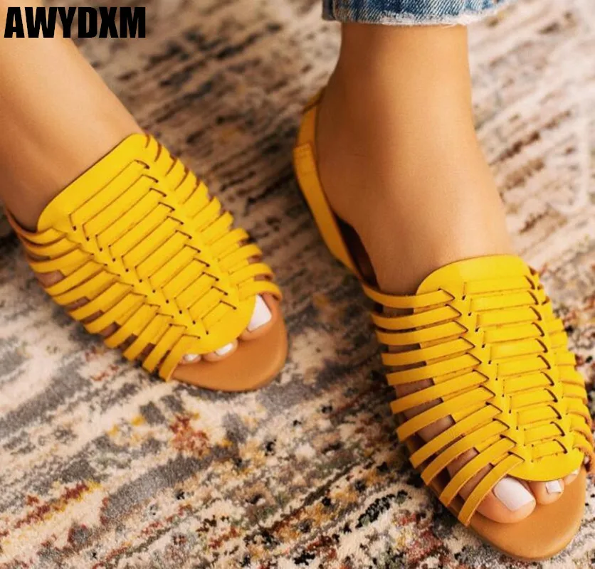 استعارات ل النسيج النساء الصنادل جديد الصيف فم السمكة روما صندل مسطح السيدات الضحلة جوفاء زلة على حذاء كاجوال امرأة أحذية Mjuer S264